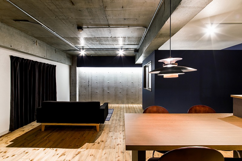 お客様のご要望通りにまずは水廻りの新規更新の為に全面的な解体からリノベーションはスタートした。その中でRC造の躯体の状態が綺麗な箇所が出て来たので、リビングの天井と壁面を打ちっ放しのスケルトンにし、クリア塗装でご要望のインダストリアルな雰囲気と粗々しさを生かした。メンズライクなデザインに重点を置き、全体的なカラーをブラックやネイビーで統一した。また床材は無垢材を使いウォルナット色で着色をし重厚さとヴィンテージ感を表現した。